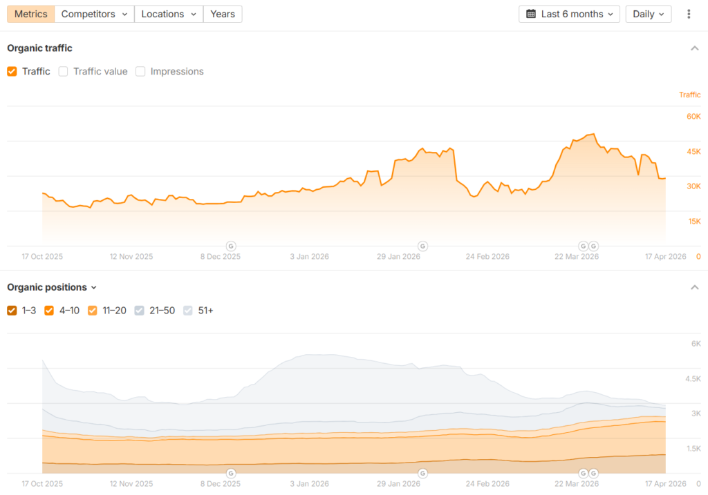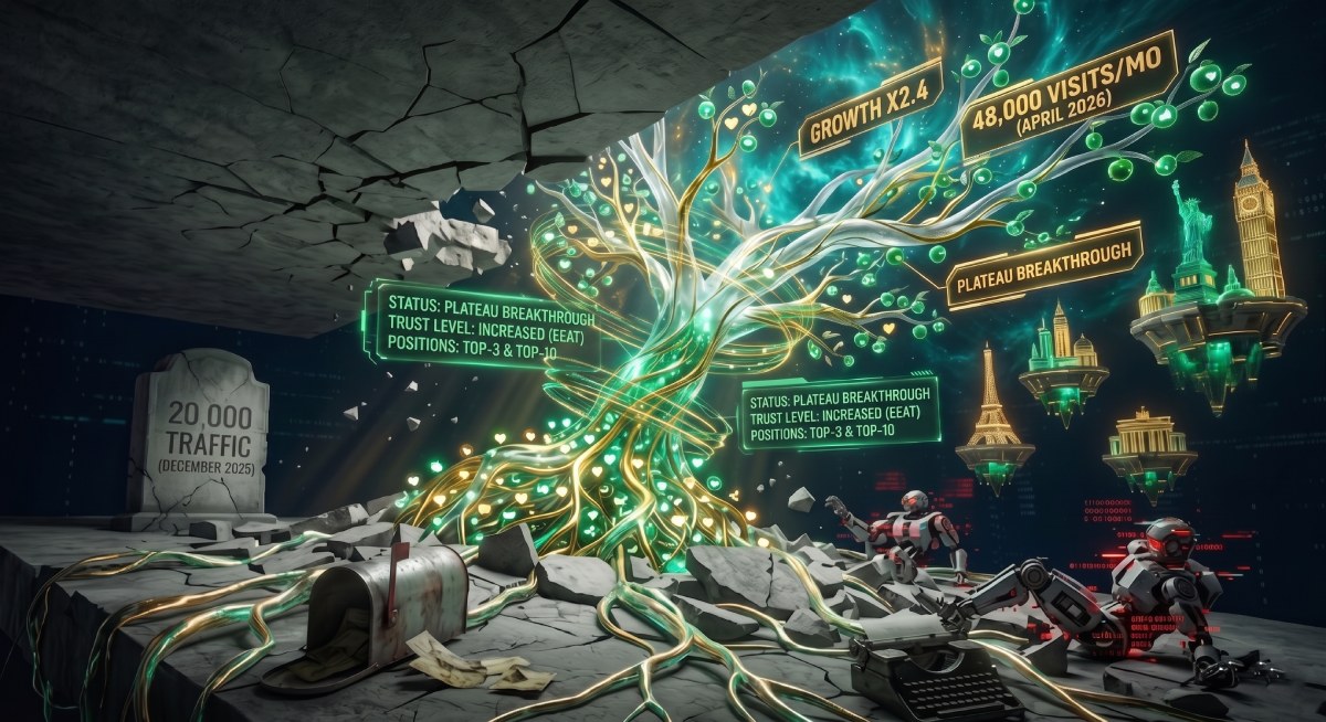 Result: Organic traffic growth from 20,000 to 48,000 unique visits per month by April 2026. Successful exit from “stagnation” due to the implementation of a native links strategy.