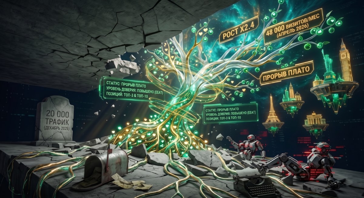 Результат: Рост органического трафика с 20000 до 48000 уникальных визитов в месяц к Апрелю 2026 года. Успешный выход из «застоя» за счет внедрения стратегии нативных ссылок.