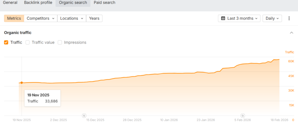 Результат: Зростання трафіку до 60 000+ унікальних візитів на добу до лютого 2026 року. Домінування в ТОП-1 за запитами рівня «citizenship by investment», створення невразливого для апдейтів посилального профілю.