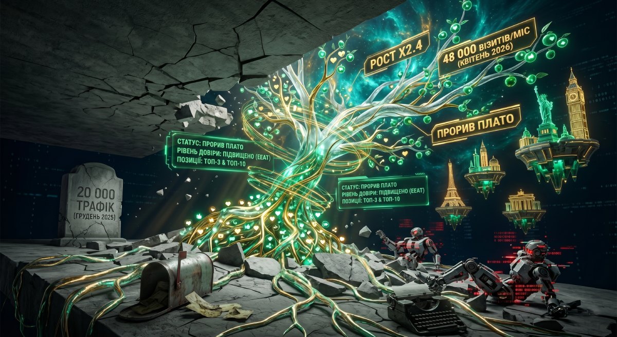 Результат: Зростання органічного трафіку з 20000 до 48000 унікальних візитів на місяць до Квітня 2026 року. Успішний вихід із «застою» за рахунок впровадження стратегії нативних посилань.